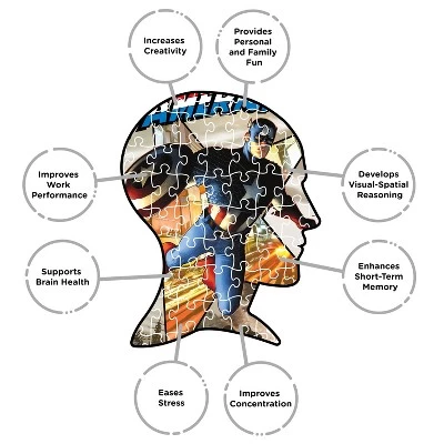 Precision Fit, Premium Quality, Glare Free, Virtually No Puzzle Dust. Increases creativity, Provides Personal and Family Fun, Develops Visual-Spatial Reasoning, Enhances Short-Term Memory, Improves Concentration, Eases Stress, Improves Work Performance, Supports Brain Health