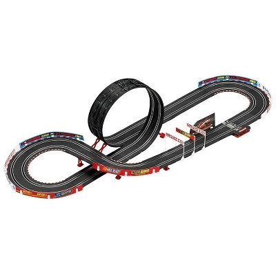 - Includes 16 feet of 1:43 scale race track, transformer, (2)1:43 scale cars, (2) speed controllers, transformer, and decorative elements for the track
