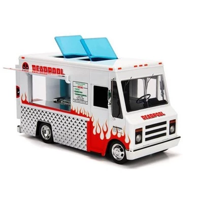 Brand new 1/24 scale diecast model of Deadpool Taco Truck with Deadpool Diecast Figurine “Marvel” Series die cast model by Jada.Brand new box.Real rubber tires.True-to-scale detail.Detailed interior, exterior.Officially licensed product.Manufacturer’s original unopened packaging.Made of diecast metal with some plastic parts.Deadpool figurine is approximately 2.75 inches tall.Dimensions approximately L-8.5, W-3.5, H-4.5 inches.Has opening roof vents, side door, serving window and rear kitchen doors.Please note that manufacturer may change packing box at any time. Product will stay exactly the same.