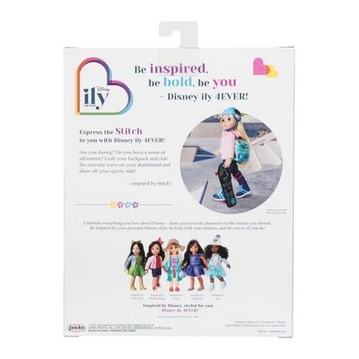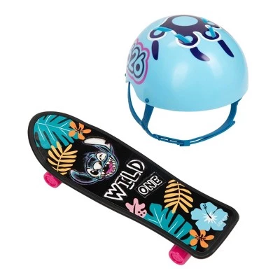 Inspired by Stitch, this Disney ily 4EVER skateboarding set is perfect for your favorite 18-inch doll. Your doll will be ready to ride the concrete wave with this accessory set featuring a Stitch inspired skateboard, safety helmet, and knee pads. Complete your doll’s sporty look with a cool backpack and blue high-top shoes – now your doll is ready for a thrilling ride. A cool Stitch sticker sheet is included to customize the skateboard. Accessory set is shown on Inspired by Ariel doll and is compatible with most 18-inch dolls. (Dolls sold separately, available at Target)