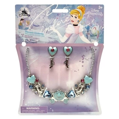 Lend a magic touch to any Cinderella ballgown with this breathtaking jewelry set designed to complement our costume collection. A silvery necklace with pumpkin coach and mice filigree, gem hearts, and faux pearls, is matched by heart earrings with shining slipper bobs. Inspired by Walt Disney’s Cinderella. Genuine, Original, Authentic Disney Store Product.