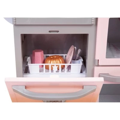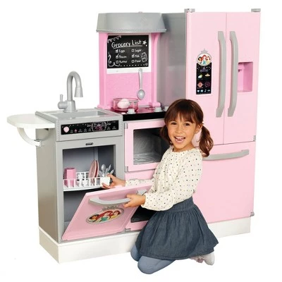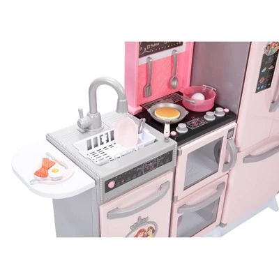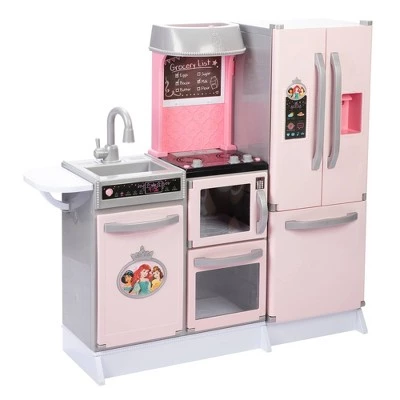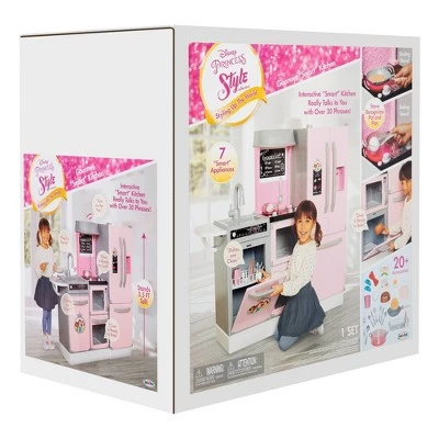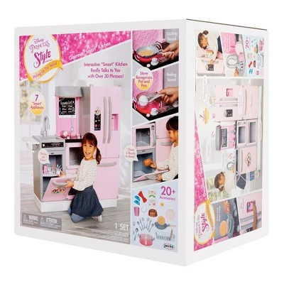 Sleek, unique, and oh so fun, the Disney Princess Style Collection is meant for every modern girl with big goals and great style. With its stunning design and high-tech features, this Gourmet “Smart” Kitchen takes your play cooking to the next level! This interactive kitchen includes seven feature appliances and over 30 sounds and phrases as prompts while you play. Turn handle on the faucet to hear water sounds and dishwater features washing sounds and indicates when cleaning cycle is complete. The overhead hood includes a fan sound. Microwave and Oven include lights and sounds. Refrigerator indicates when the door is left open and includes a play ice dispenser. The Stovetop includes light up burner and will even let you know when to flip your pancake or fried egg while using the fun flipping fry pan! The Gourmet “Smart” Kitchen comes complete with 20+ pieces, including cooking utensils, service for two, and foods items. Bon Appétit!