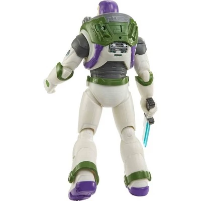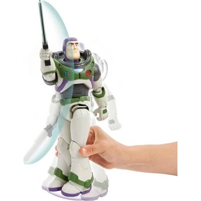 Discover Disney Pixar’s Lightyear, Stranded on an uncharted planet, Buzz Lightyear and his crewmates will need to battle hostile plants, giant bugs and the ultimate threat, Zurg, to complete their mission and return home. This large talking Laser Blade Buzz Lightyear action figure with exciting lights, motion and sounds brings the action and thrills of the movie home! Holding his Laser Blade DX, he’s ready to fight his way through all his foes. Squeeze his legs together to see him lift the glowing laser blade up and across his body and strike it downward. His motion is accompanied by a galaxy of dynamic sounds and phrases delivered in a random order that will spark creative battle, flight and leadership play! Listen for sword-whistling sound effects and dialogue, more than 30 sounds in all! At 11.5 inches tall, this Buzz Lightyear wears the Alpha suit from the movie and is easy for fans of any age to pose and manipulate. Makes a great gift for Lightyear fans ages 4 years and older. Colors, dimensions and decorations may vary.