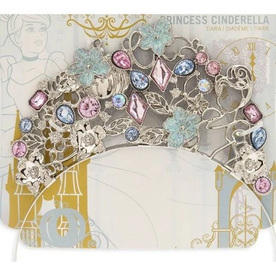 Attend a royal coronation of your princess-to-be by topping the ensemble with this bejeweled silver tiara. Glittering enameled flowers and fanciful filigree highlight the crowning glory of any Cinderella costume. Cinderella silhouette and floral filigree. Accented by faceted gems and glittering enameled roses. Protective tips. Genuine, Original, Authentic Disney Store Product.