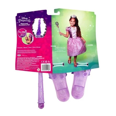 Step into the story of Disney Princess Rapunzel with this complete Disney Princess Rapunzel Accessory Set! It’s the perfect set to complement your Rapunzel dress and have you feeling like a true Disney Princess. The set includes a gorgeous jeweled tiara, a pair of sparkling shoes, and a fun wand, each with a Disney Princess character cameo.
