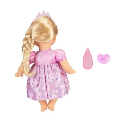 Start a fairytale connection with sweet and adorable, Disney Princess Baby Rapunzel. Baby Rapunzel is dressed in her story inspired tiara and soft dress, featuring icons special to Rapunzel herself. She has a soft body; perfect for cuddling and hugging and with a little help Rapunzel can hold her matching bottle. Cherish, nurture and care for your Baby Rapunzel Doll.