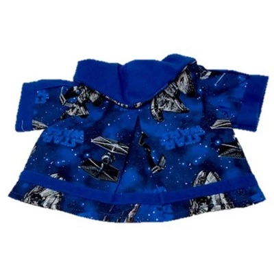 Cotton licensed print star wars fabric with blue faux fur trim around the collar, front and bottomVelcro opening in the frontShown on a 11 1/2 inch Yoda but also fits the 11 inch Yoda alsoDetailed pleat in the backThis listing is for the robeDoll is not includedFast free shipping