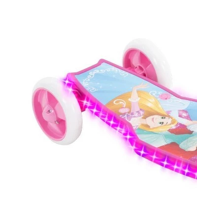 This kid’s scooter is designed for durability and is ready for sidewalk fun. Durable steel frame has fully decorated handlebar stem. Your child will have fun with this LED light Princess scooter by Huffy.