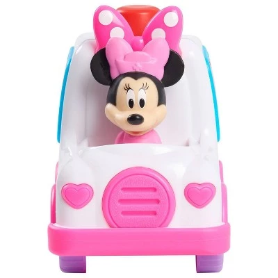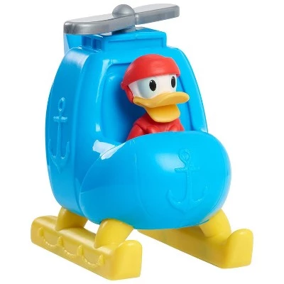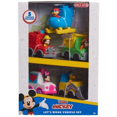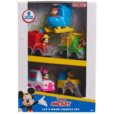 - This five-piece vehicle figure set includes Mickey Mouse in his firetruck, Minnie Mouse in her ambulance, Donald Duck in his helicopter, Goofy in his dump truck, and Pluto in his bulldozer.