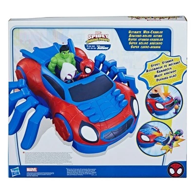 - VEHICLE INCLUDES SPIDEY STUNNER FEATURE: Go Spidey Go! Push the large button on the hood of the Ultimate Web-Crawler and the bumper pops out to knock down baddies